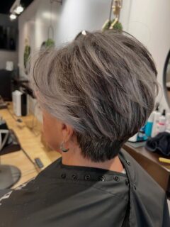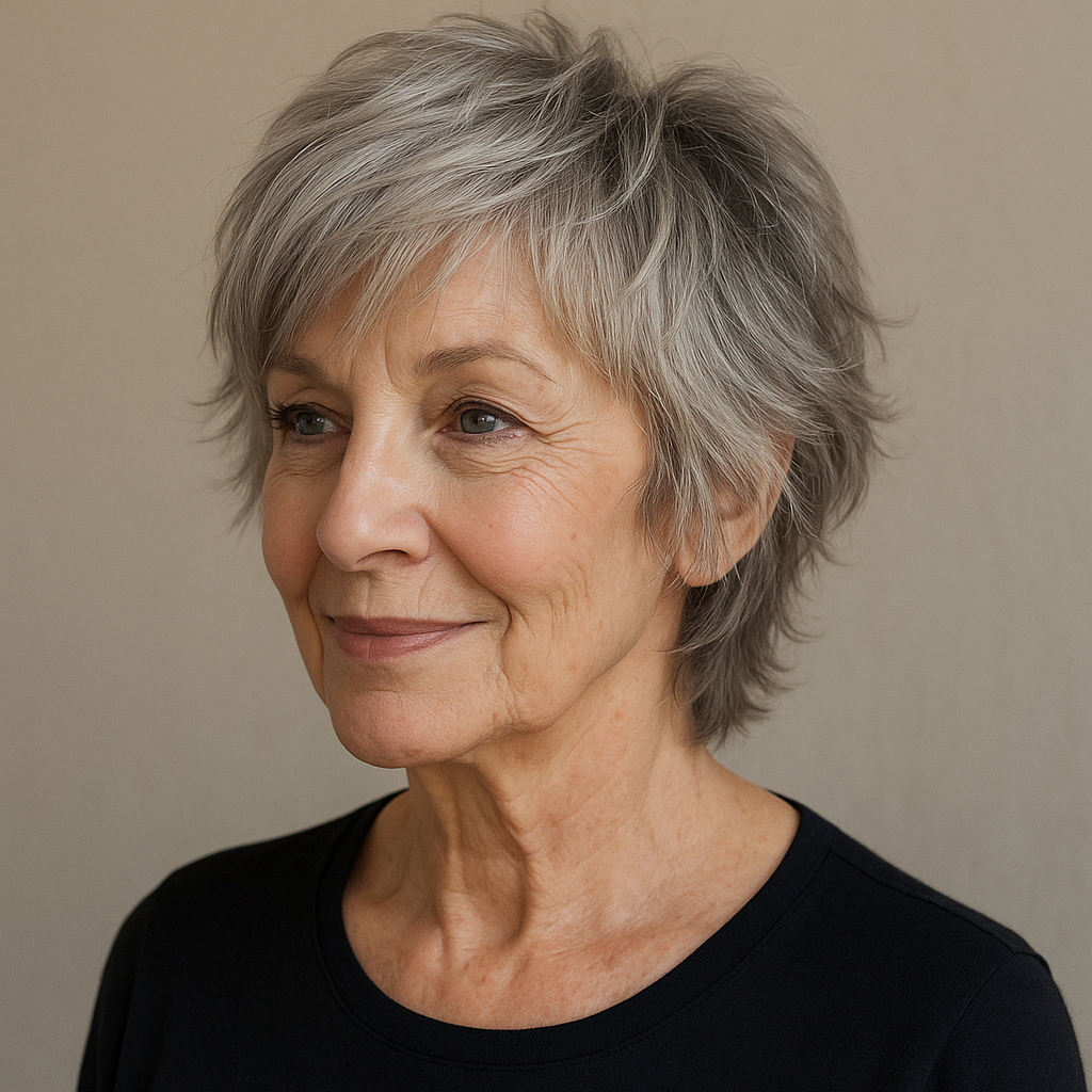 This version keeps the edges feathery and face-framing, ideal for softening angular features. It’s a versatile everyday look that works well with natural grays or light highlights. A few longer layers around the crown add height and shape without overwhelming the face.