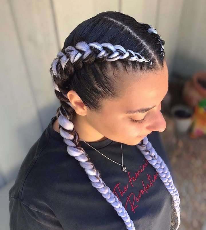 These sleek silver Dutch braids give a fresh, youthful glow to gray tones. The braids are perfectly defined, running symmetrically from the crown down to the shoulders for a clean, polished finish. The subtle gradient of silver adds a modern twist, making this look both sporty and sophisticated—perfect for days when you want your style to feel cool and confident.