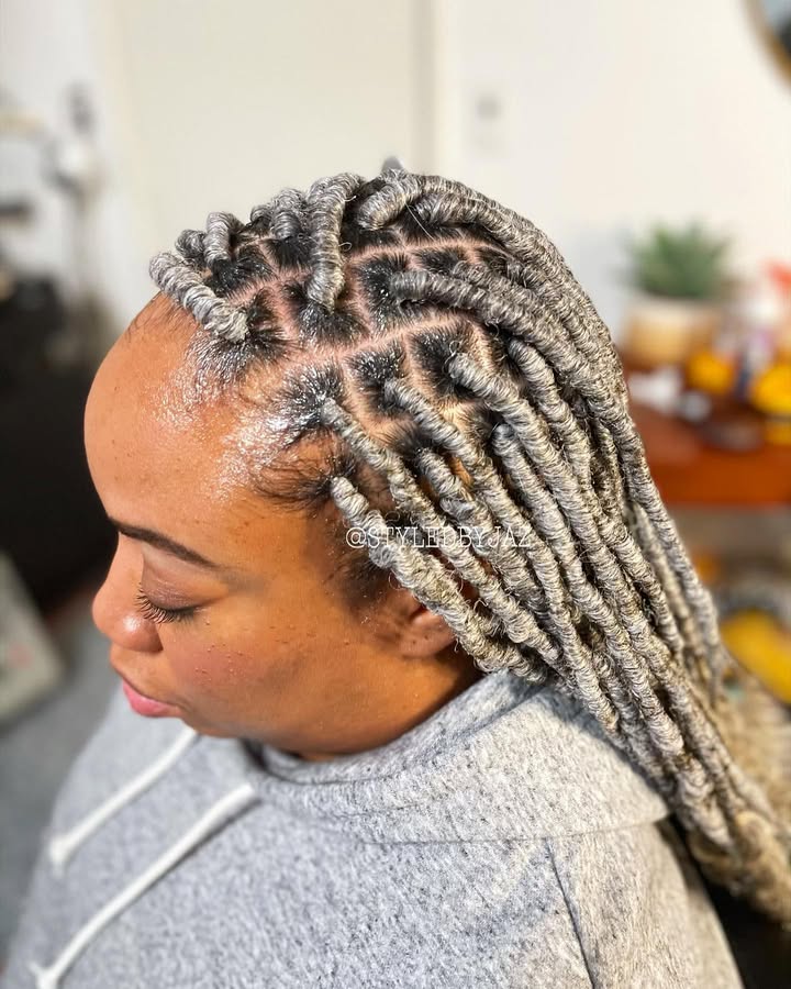 These micro gray twists are delicate, lightweight, and full of natural texture. The fine twists blend shades of silver and charcoal, giving the hair a soft, dimensional glow. This style offers versatility and elegance, perfect for those who love a refined, low-maintenance look that still stands out beautifully.