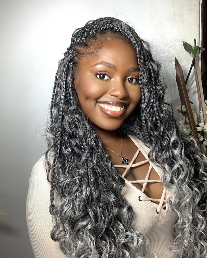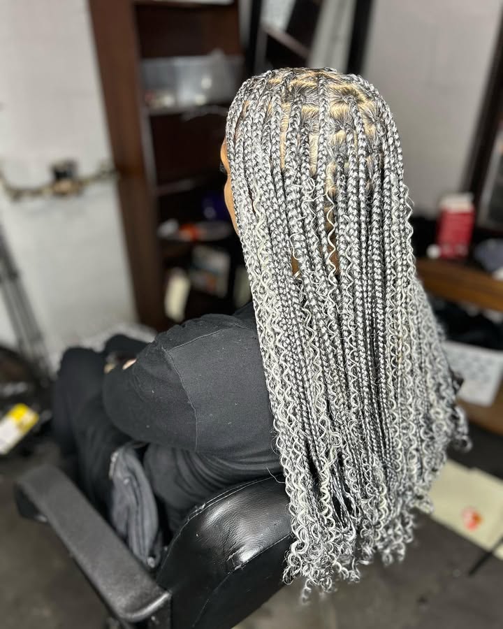 These gray boho braids strike the perfect balance between structured and carefree. The neat plaits transition into soft, curly ends that add movement and texture, creating a lively, youthful look. The mix of tones enhances the natural depth of gray, while the curly finish brings a touch of playfulness that keeps the style fresh and modern.