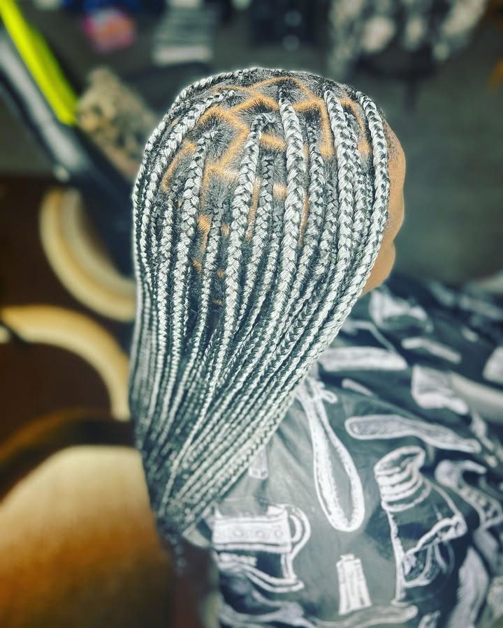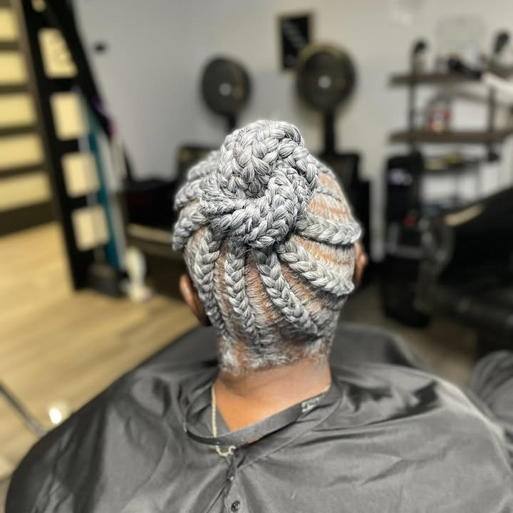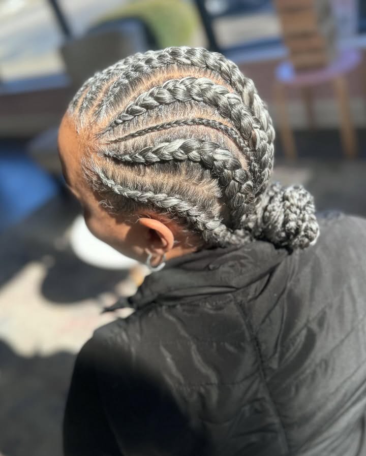 These sleek gray cornrows are all about precision and grace. The braids flow smoothly toward the back, meeting in a neat low bun that keeps the style refined and easy to manage. The gray tones add a soft metallic sheen, giving the look a modern twist while maintaining classic cornrow structure. It’s a polished, confident style that’s perfect for everyday wear or professional settings.