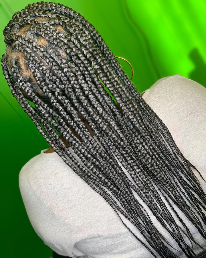These gray knotless box braids are sleek, lightweight, and effortlessly stylish. The knotless technique gives a natural, seamless look that blends beautifully with the scalp, while the silvery hue adds a modern, radiant touch. Perfect for those who prefer comfort and flexibility, this style moves freely and shines with understated elegance.
