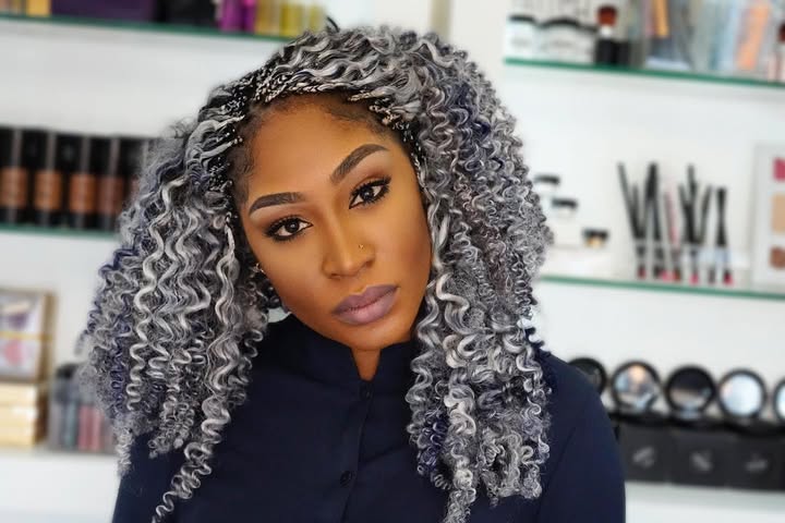 These curly gray crochet braids are full of texture and volume, giving off an effortlessly glamorous vibe. The soft curls frame the face beautifully, while the mix of silver and charcoal tones creates a multidimensional look that’s both bold and feminine. It’s a striking style that adds movement and life to gray hair, perfect for anyone who wants to stand out with a playful yet elegant finish.