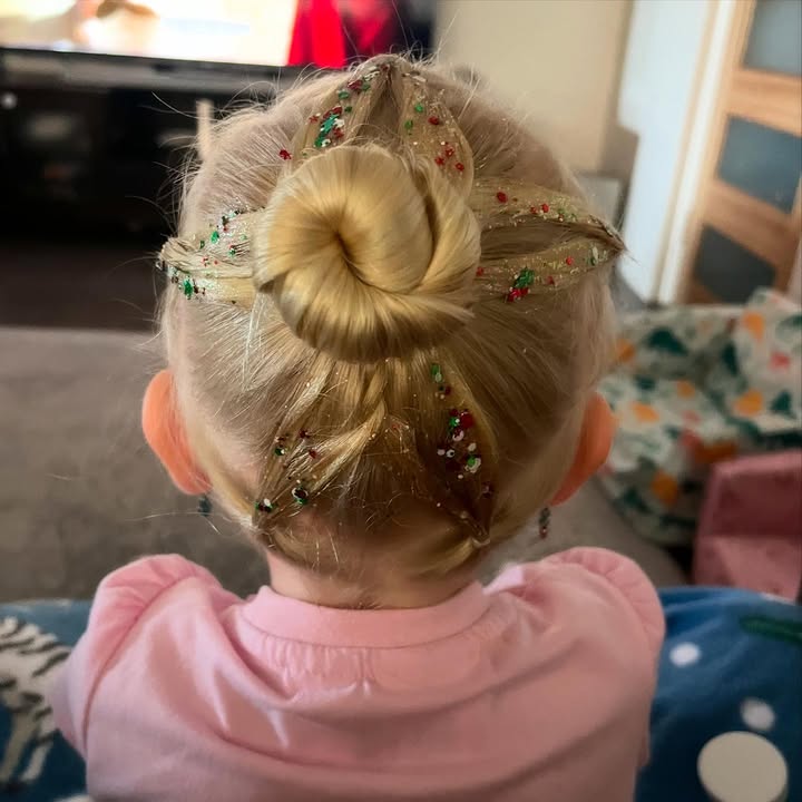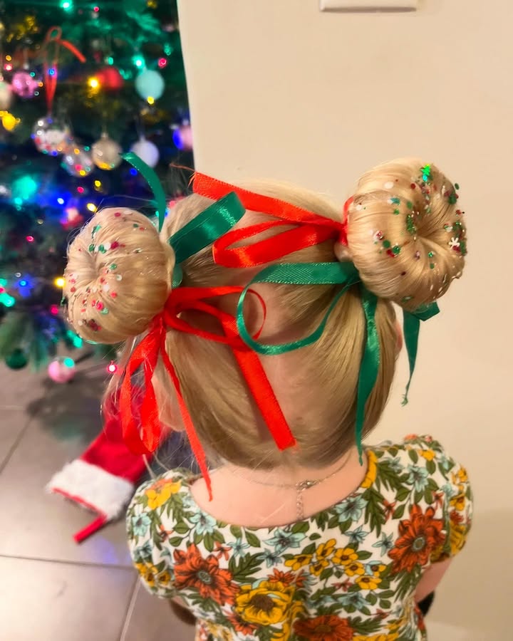 These glitter-dusted space buns are a lively and joyful option for the holidays. The red and green ribbons create a festive color palette while adding movement and personality. This style works well for energetic kids who love something bold, fun, and full of holiday cheer. It pairs perfectly with Christmas dresses and party outfits.