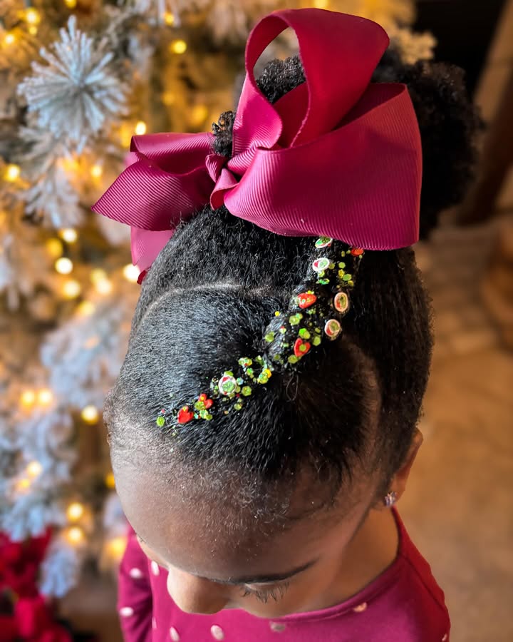 This style is perfect for girls who want something elegant yet full of personality. The high puff creates beautiful volume while the decorated hairline made of tiny Christmas gems adds a magical sparkle. The oversized berry-red bow instantly elevates the look, making it ideal for church services, holiday dinners, and formal Christmas events. It beautifully celebrates natural hair textures during the festive season.