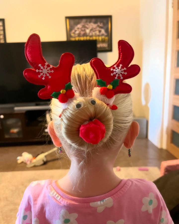This fun reindeer-inspired bun is perfect for children who love playful holiday looks. The sleek bun forms the “face,” complete with a fluffy red pom-pom nose and tiny googly eyes for personality. The red antlers add bold festive flair, making this one of the most memorable girls Christmas hairstyles for school spirit days, Christmas jumper day, or themed photos.