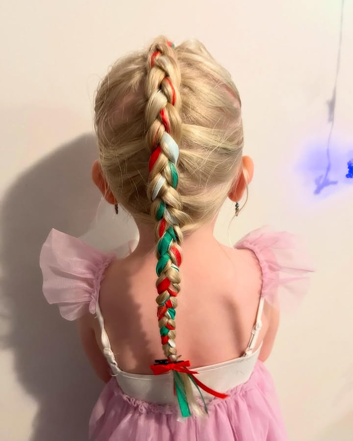 This long Dutch braid gets a beautiful seasonal twist with red, green, and white ribbons woven seamlessly into the sections. The result is a polished yet youthful hairstyle that stands out without being too complex. It is a fantastic pick for Christmas Eve gatherings, holiday church service, or festive photo sessions.
