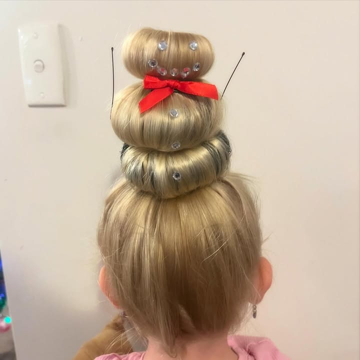 This creative updo turns stacked buns into a charming snowman silhouette, complete with tiny gems and a red ribbon scarf. It celebrates the whimsy of the season and works beautifully for girls who want a standout hairstyle for Christmas parties. Even though it appears detailed, the structure holds firmly, making it ideal for long days filled with activities.