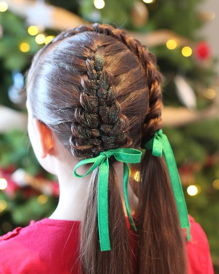 7. Braided Christmas Pigtails with Glitter and Green Bows