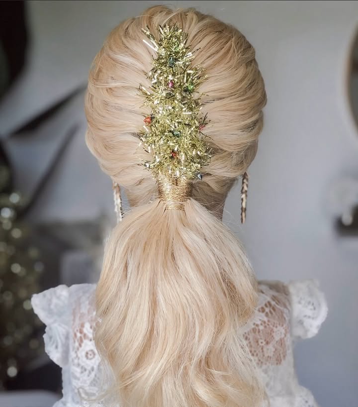 This glamorous ponytail stands out instantly with its gold tinsel centerpiece. The tinsel creates a mini Christmas-tree effect at the crown, adding sparkle, texture, and a magical festive touch. The ponytail itself cascades beautifully, making this style perfect for Christmas photos, dressy events, and storytelling holiday moments.