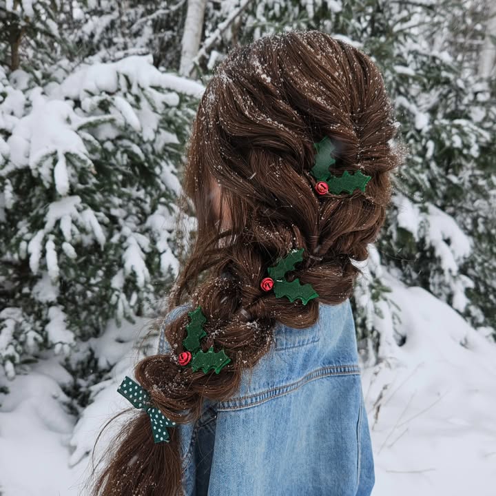 This winter-inspired braid looks straight out of a Christmas card. Loose, voluminous weaving gives the braid a soft, romantic texture, while the holly leaf clips add a beautiful seasonal finish. Light artificial “snow” sprinkled through the hair enhances the magical effect. This is a stunning hairstyle for outdoor Christmas photos, school concerts, or holiday family gatherings.