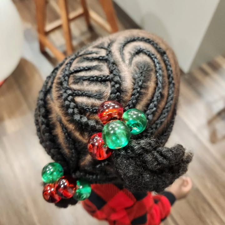 This style showcases artistic cornrow patterns adorned with bold Christmas-themed beads. It is a perfect protective hairstyle for the holiday season and allows for long-lasting wear. The red and green beads instantly give it a celebratory feel, making it a wonderful choice for Christmas week, family gatherings, or daycare parties.