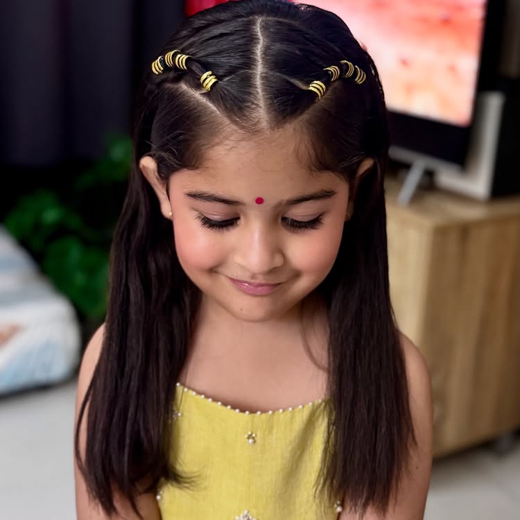This simple and graceful hairstyle is perfect for girls who prefer a minimal and neat festive look. The two soft twists are upgraded with stylish gold thread bands that bring subtle holiday shine without overwhelming the style. It pairs beautifully with dresses and works for both casual and formal Christmas events. This is a great choice for parents who want a quick, tidy, and comfortable hairstyle.