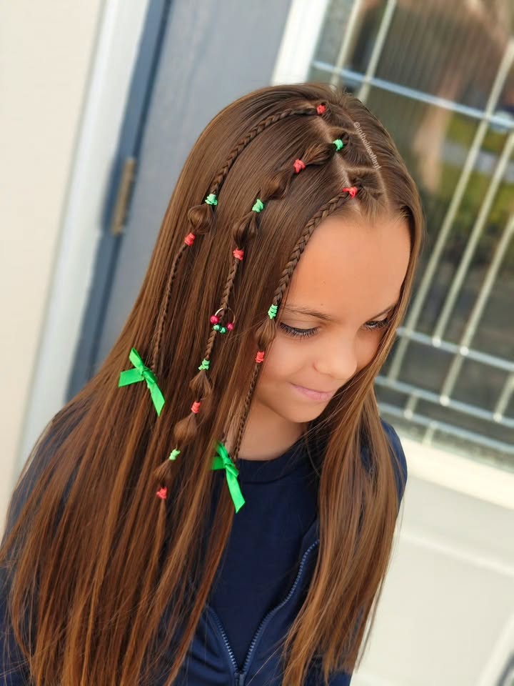 This soft, flowing hairstyle uses tiny braids decorated with red and green elastics to bring subtle Christmas color into everyday hair. It’s ideal for girls who want something gentle and pretty rather than structured. The small details make a big impact in photos, and this look pairs beautifully with both casual and dressy holiday outfits.