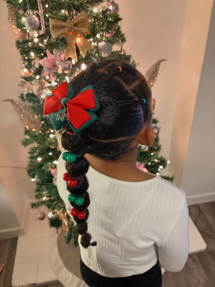 This hairstyle is full of festive charm thanks to the bold red and green beads added throughout the bubble braid. The top is carefully braided to keep everything smooth and neat, while the oversized bow at the crown finishes the look with holiday flair. This style works especially well for Christmas morning, school celebrations, and fun family events.