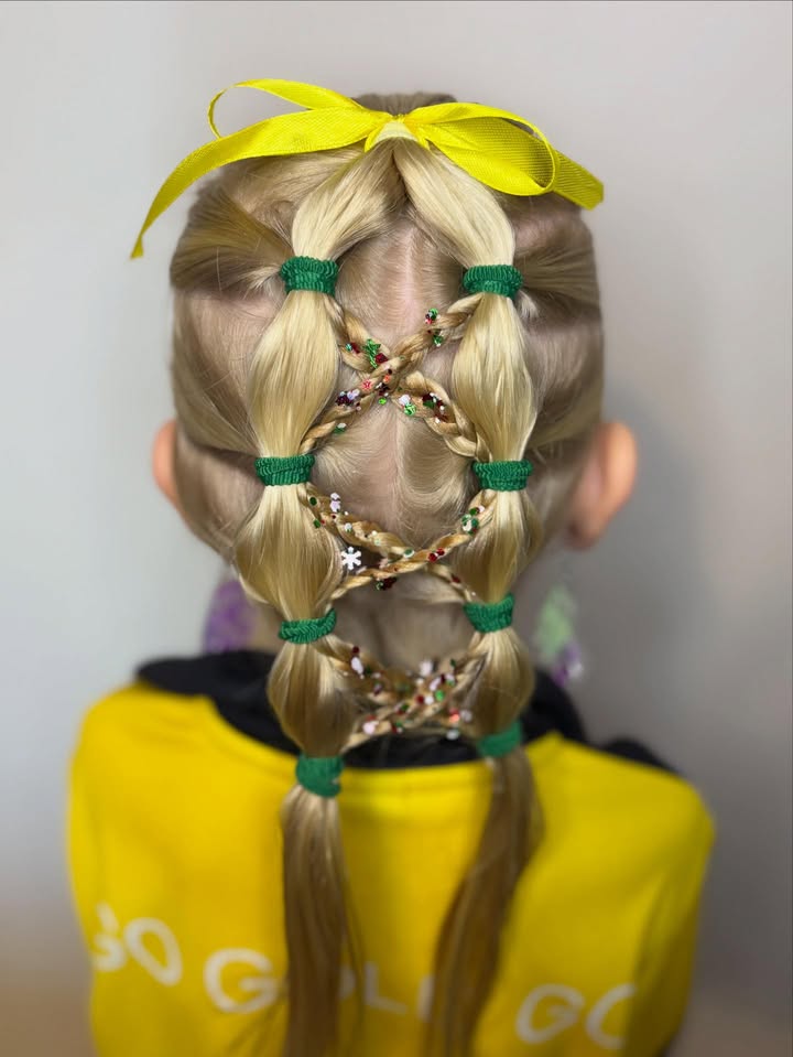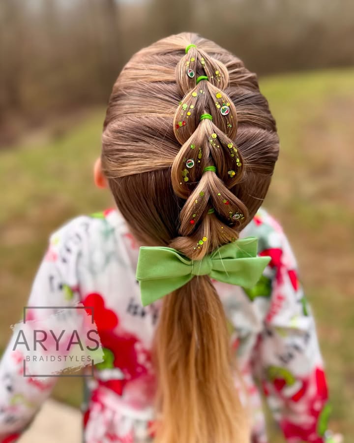 This playful bubble-braid ponytail brings together structure and sparkle. Each bubble section is decorated with tiny festive glitter dots that add a cheerful Christmas glow. The green bow at the base completes the look, making it perfect for active girls who still want something stylish and seasonal. It is secure, comfortable, and very photo-friendly.