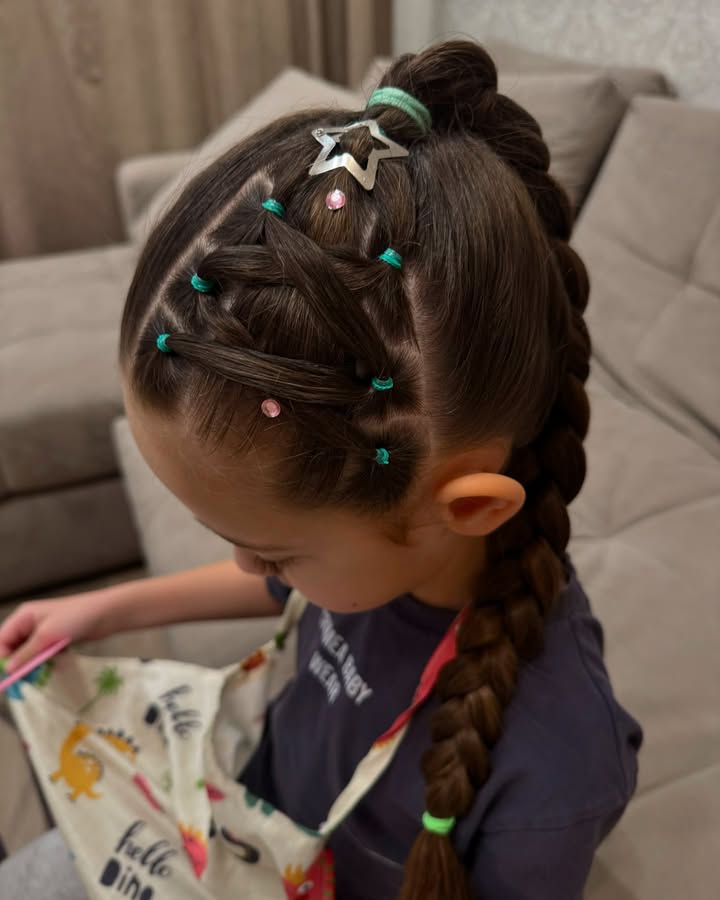 This adorable hairstyle transforms the back of the head into a mini Christmas tree. Sectioned bubbles create the tree shape, secured with green elastics, while a golden star clip sits proudly at the top. This is the perfect playful hairstyle for toddlers attending daycare festivities, Christmas playdates, or family holiday gatherings.