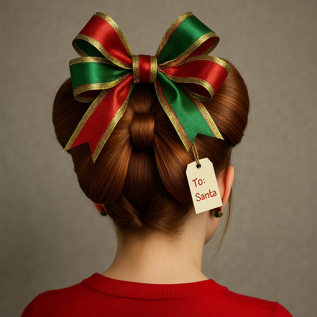 Small hair elastics and sectioning clips are essential because most Christmas hairstyles rely on small, separated parts. Temporary color sprays in red, green, silver, or gold can help you create a bold, playful look without long-term commitment. Tinsel extensions add shimmer and movement, while bows and ribbons bring in the traditional Christmas aesthetic. Mini ornaments, bells, Christmas-tree hair coils, and snowflake clips add an extra festive touch. You may also want strong-hold gel, clear wax, or edge control to achieve smooth edges or sculpted shapes.