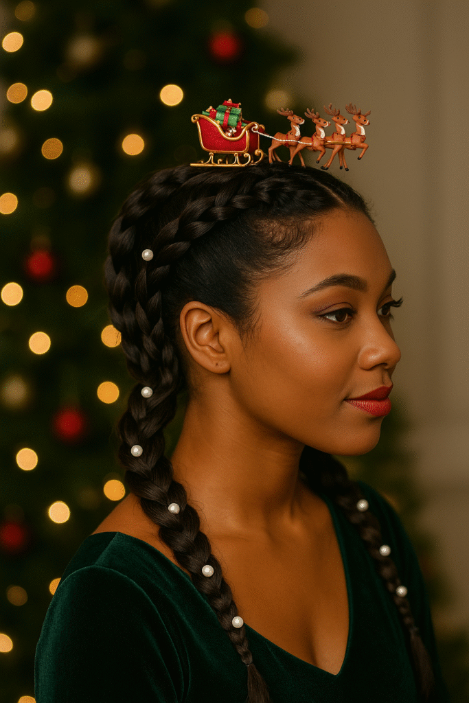 Hair is sectioned into two long Dutch braids that meet in the back and form a track-like pattern. A tiny toy sleigh carrying mini reindeer is clipped onto the braids.
